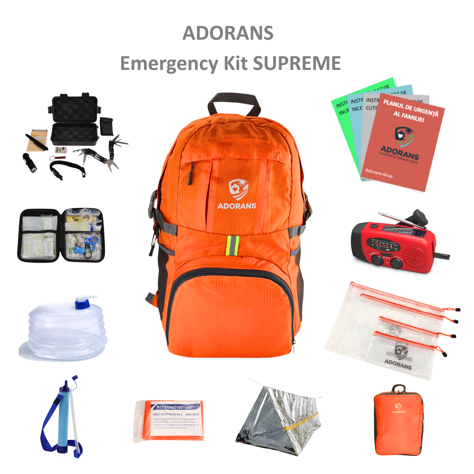 ADORANS Emergency Kit SUPREME este trusa de urgenta premium, echipata cu radio multifunctional HM-071, rucsac impermeabil si toate accesoriile esentiale pentru siguranta ta si a familiei in situatii critice.