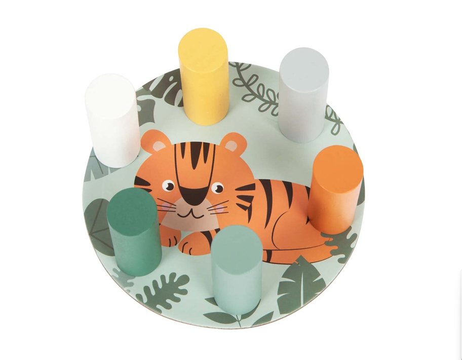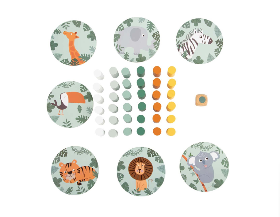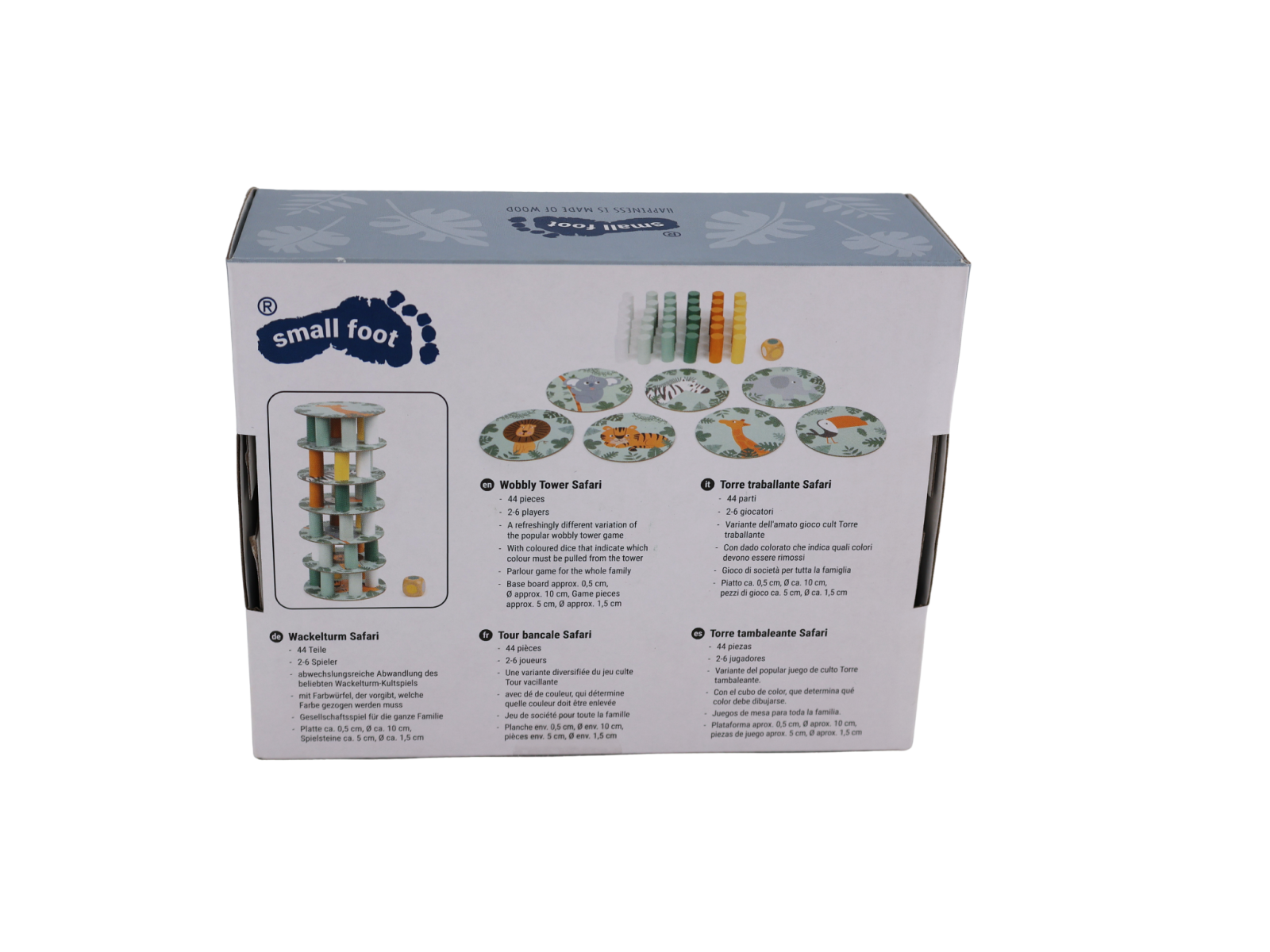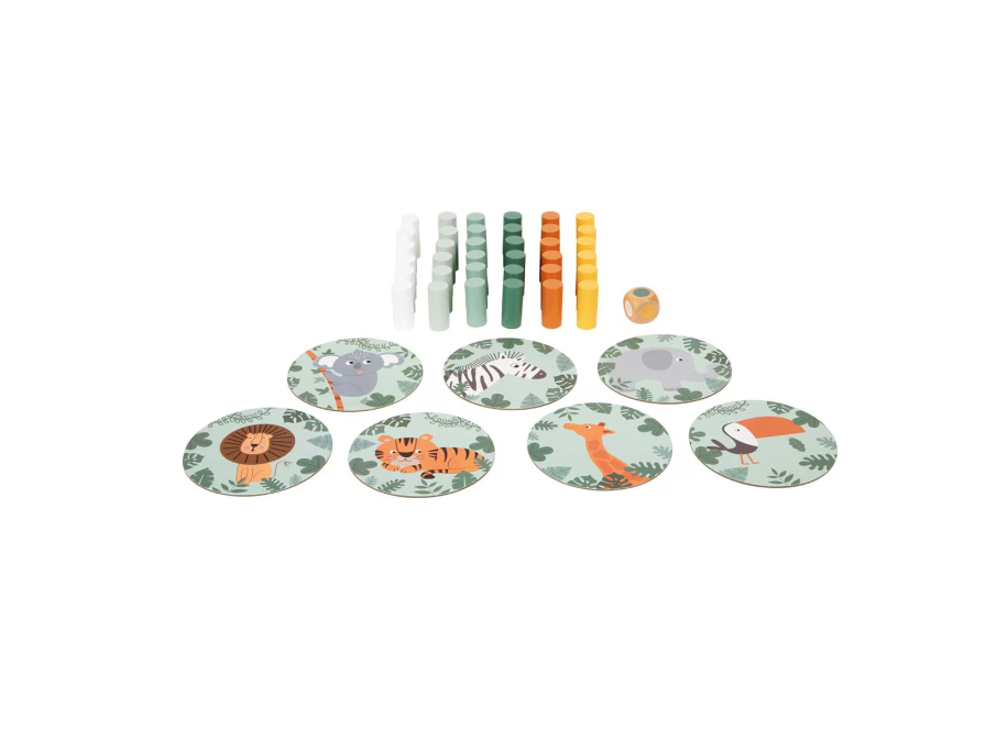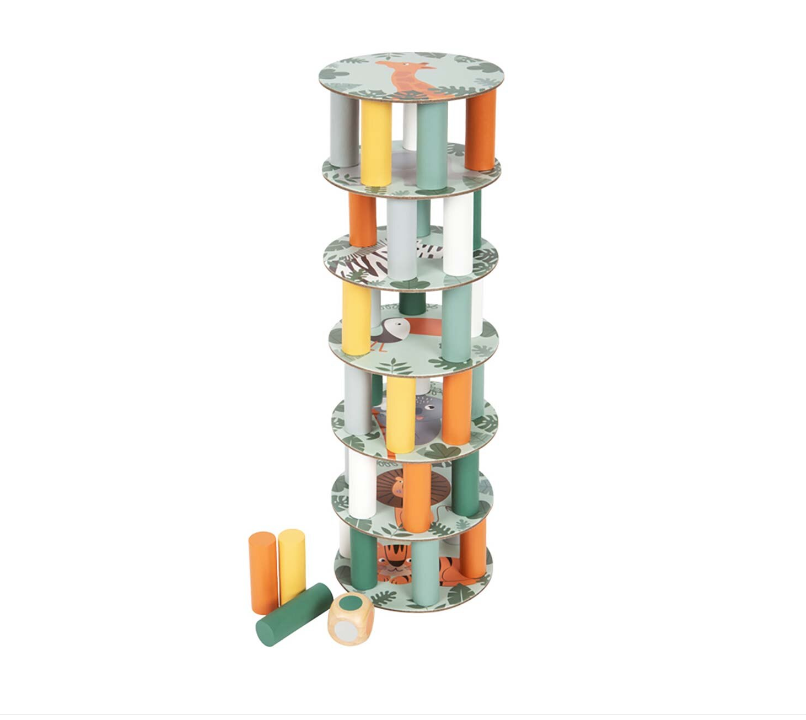 Construiește turnul din piese colorate, apoi extrage pe rând câte o piesă fără să-l dărâmi! Zarul indică ce piesă trebuie scoasă, iar animalele Safari adaugă un plus de distracție și imprevizibilitate.